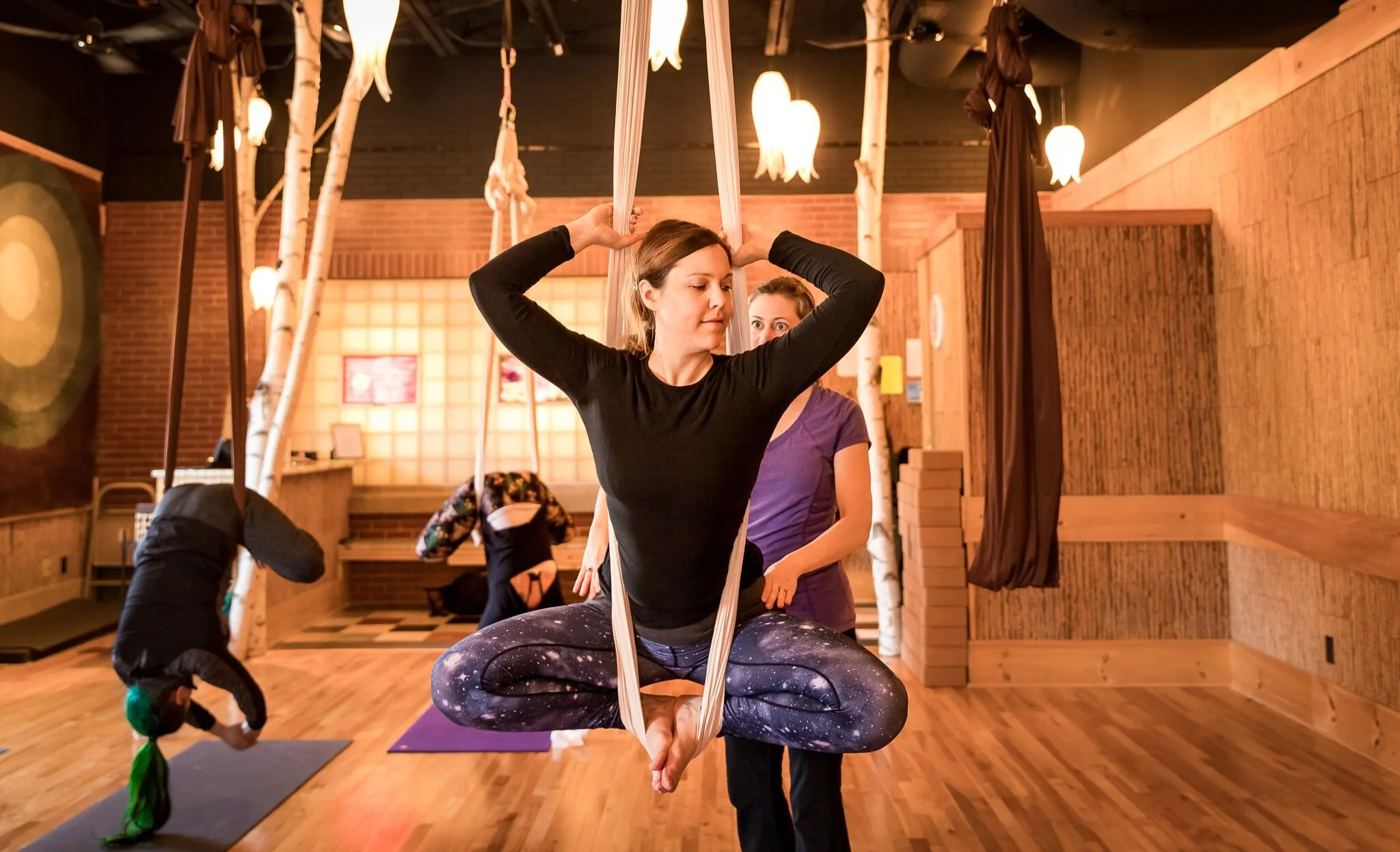 Aerial Yoga is the practice of traditional Hatha yoga with a soft fabric hammock suspended a few feet off the ground. The hammock is a prop like a strap or block, intended to assist alignment, deepen awareness and provide immediate benefits of spinal decompression. With the weight of the body partially or fully supported along with the help of gravity and the fabric, you can explore and possibly create space in your body as intended in traditional yoga practice.